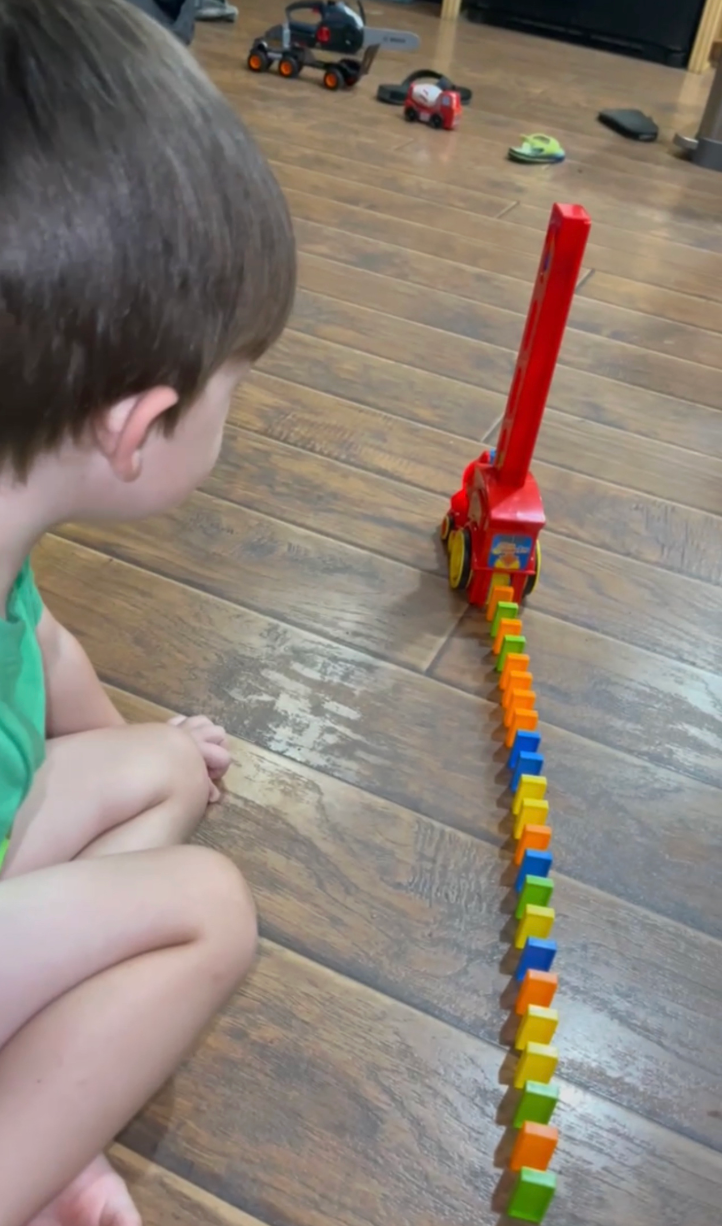 El tren deja cada dominó en su lugar y tu hijo inventa circuitos, combina colores y juega por largos minutos sin aburrirse.